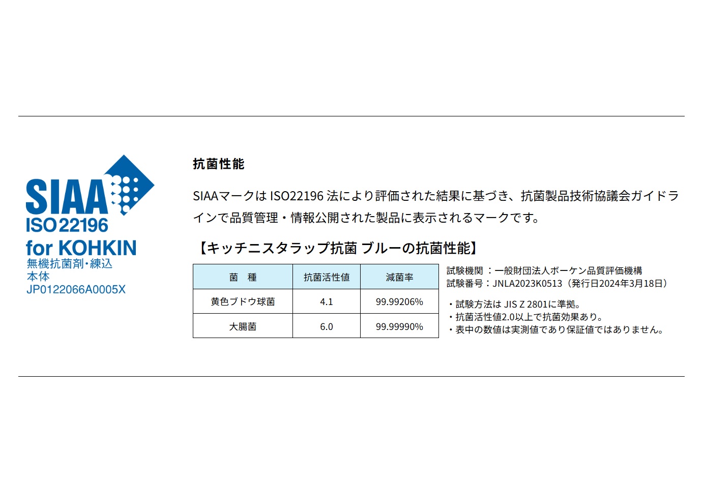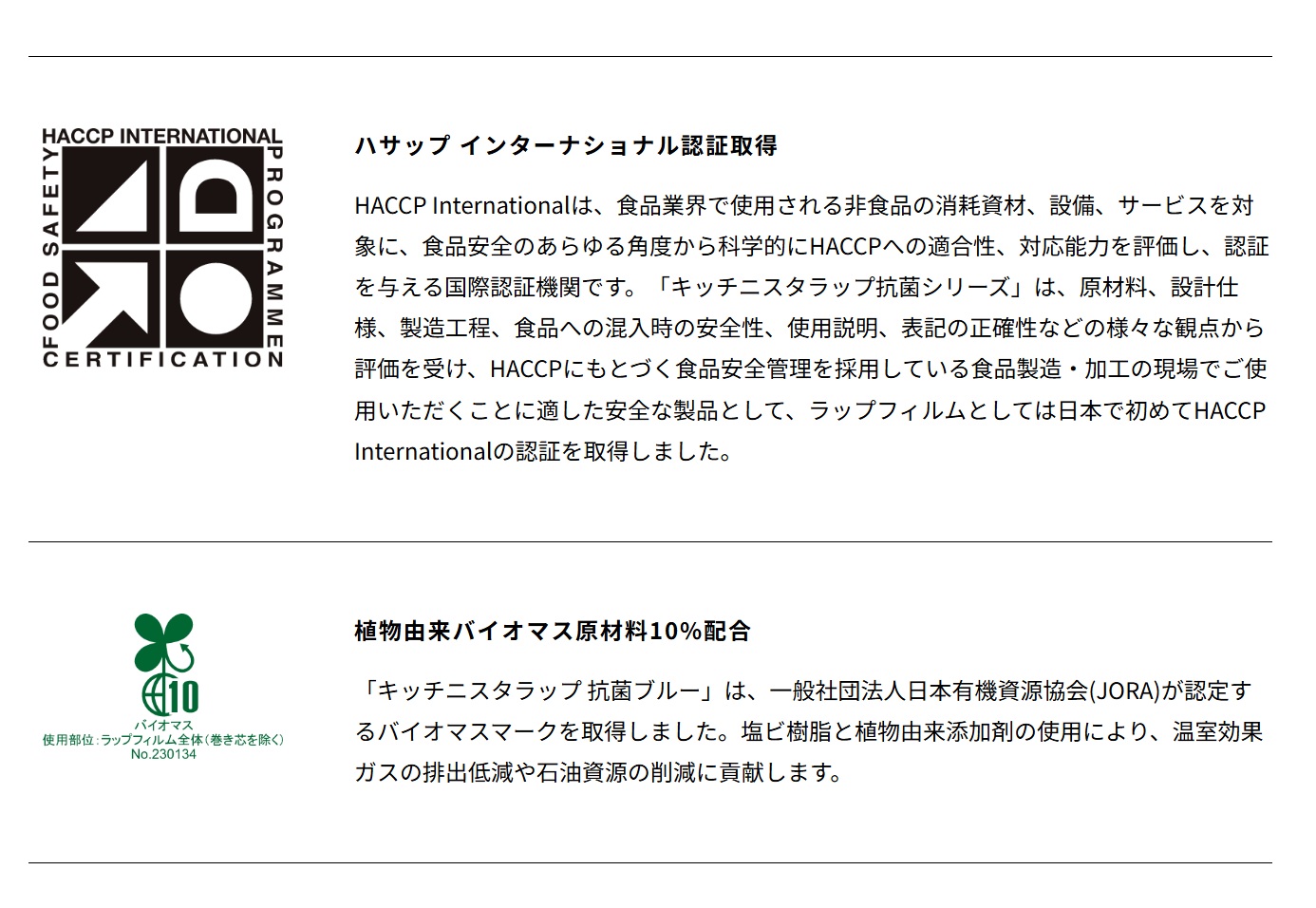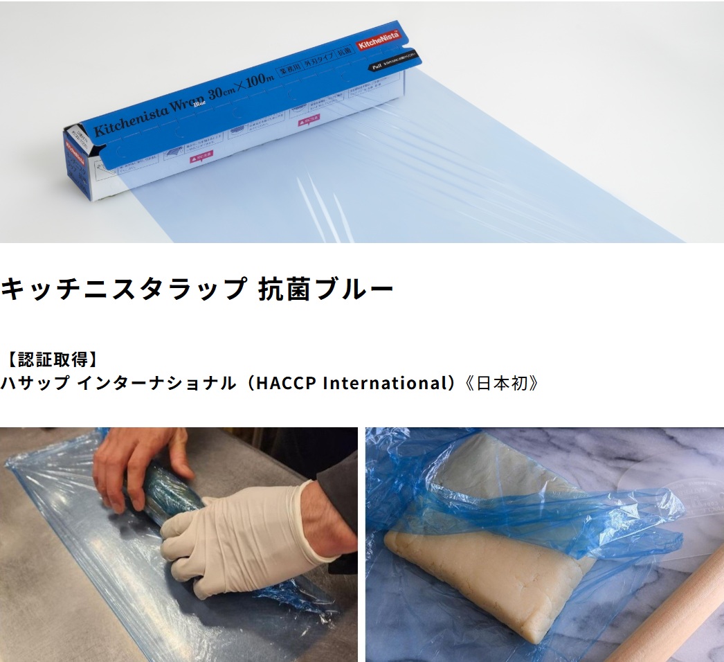 | 商品説明 | 青は食材に少ない色のため万一、食材や料理にラップ片が混入しても青いラップだと見つけやすい。 日本で初めてHACCP Internationalの認証を取得したラップフィルムとして、飲食や食品製造の現場で異物混入の防止対策を強化します。 食品調理工場、給食や介護施設、ホテルやレストランといった飲食店の厨房など、食の安全管理が求められる現場に最適。 さらに抗菌性能により、ラップに付着した細菌の増殖を長時間抑えます。 |