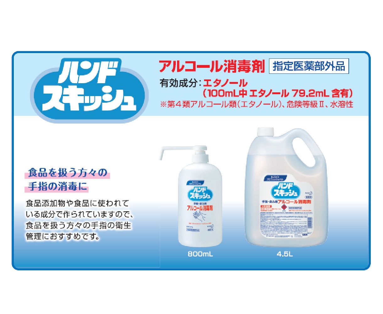 | 商品説明 | 有効成分:エタノール79.2vol% ウイルス・細菌に効果があります。 食品添加物に使われている成分のみで作られているので、食品を扱う方々の手指衛生に適しています。 素早く乾き、乾いた後の手指はサラッとしているため、衛生手袋をつけて作業をする際にはりつかず、手袋の着脱が楽にできます。 【指定医薬部外品】《危険物》 |